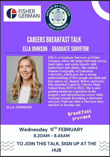 Next week you will see that we have one of our regular Career Breakfasts. Ella Johnson, who is an ex-learner from the school, will be coming in and talking to any interested learners about her role as a Graduate Surveyor. This is a great opportunity for learners to hear about the journey of a former learner from the school who has made her way into a career she loves. To sign up, learners just need to go to the Hub and put their name on the list.