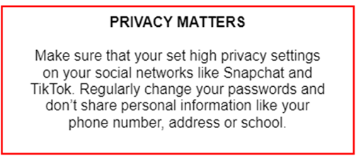It is vitally important that parents and carers check which social media groups their children are joining. Learners have been taught in school not to join open groups, for example Whatsapp and Tiktok, and give away personal details including images which show their school uniform or other personal information. Disagreements between children on social media can have a negative impact on their wellbeing whilst taking up a great deal of valuable time for staff in school.